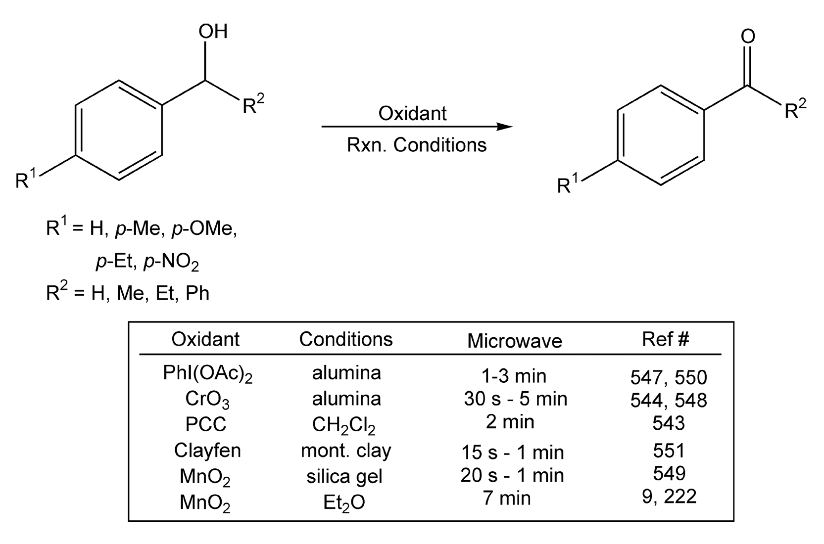 A very common reaction of alcohols is their oxidation to carbonyl compounds. Primary alcohols can yield aldehydes or carboxylic acids and secondary alcohols produce ketones. Tertiary alcohols generally will not yield any oxidized products. Numerous methods are available for oxidizing different types of alcohols. Scheme 97 shows microwave-induced oxidation of benzyl alcohols with various oxidants and methods.10,223,543-551 In all of these reactions, microwave heating increased reaction rates drastically and also increased product yields.