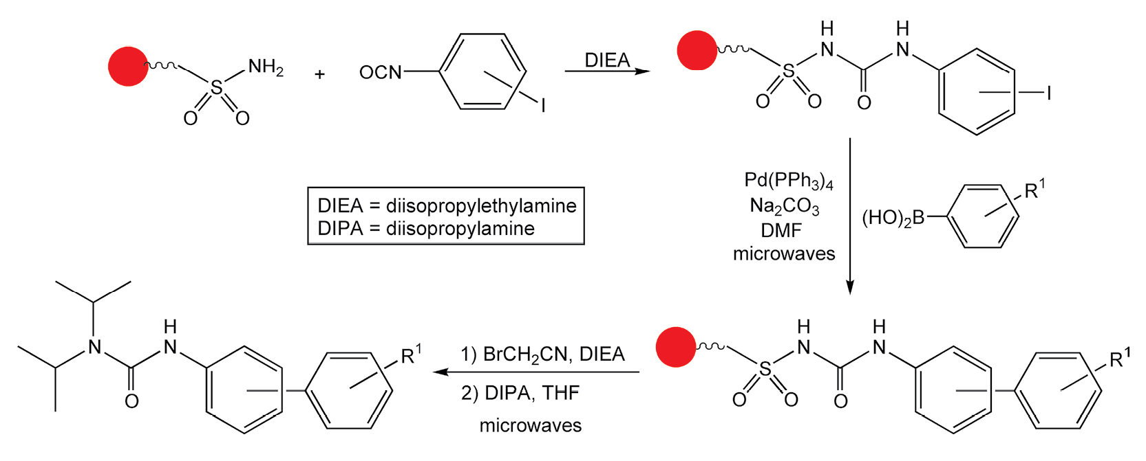 Glass and Combs have also performed rapid parallel synthesis on solid-phase resins with microwave irradiation.31 They have examined the utility of a “safety catch” sulphonamide linker to produce large libraries of diverse amides and ureas. These safety catch linkers are highly stable through a given synthetic sequence until cleavage from the resin is necessary. The linker must first be activated before nucleophilic displacement of the substrate can occur. Conventional displacement of the substrate requires a very strong nucleophile and limits library diversity. The use of microwave irradiation allows for any nucleophile to displace the resin, including weak ones. Scheme 10 shows a facile biaryl urea synthesis, which includes a Suzuki coupling reaction, linker activation via alkylation, and subsequent cleavage with diisopropyl amine (DIPA).