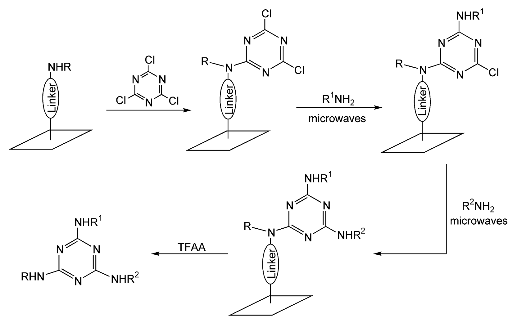 Microwave-assisted, solid-phase syntheses are not restricted to spherical bead polymer resins. Scharn et al. used a planar cellulose membrane to synthesize a parallel library of 8000 1,3,5-triazines via nucleophilic substitution reactions.40 The planar membrane is composed of an array of “spots” that are individually derivatized. Scheme 11 illustrates how an amino-functionalized spot is doped with cyanuric chloride and then diversified with different amines by microwave heating. The second nucleophilic substitution requires five hours of thermal heat for completion, but with microwave irradiation, an entire library can be synthesized in six minutes.