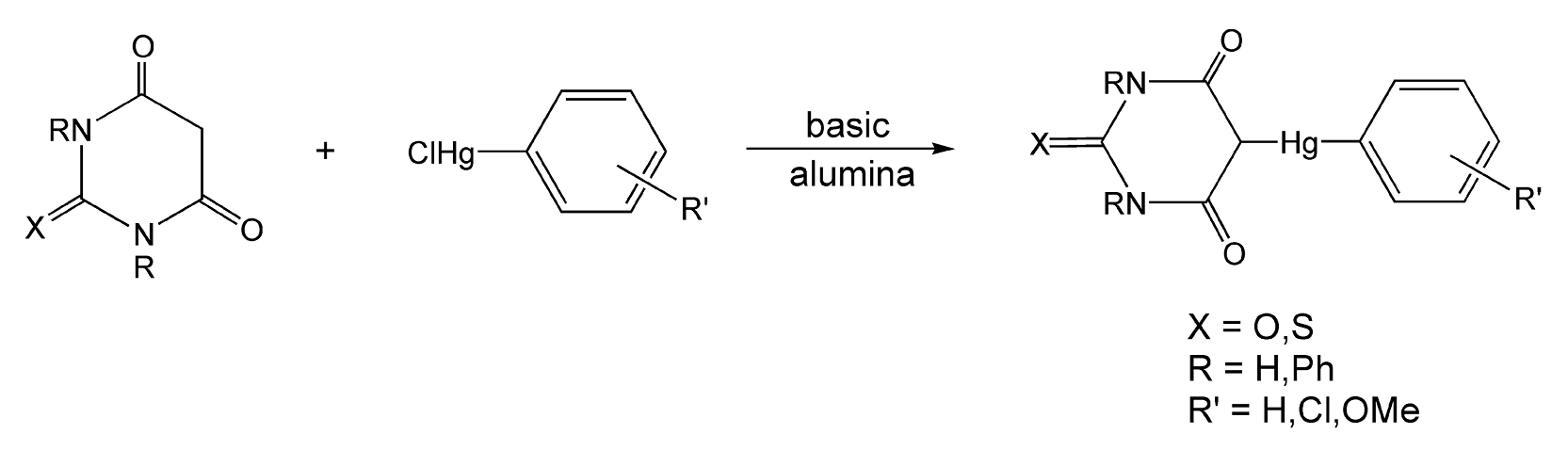 Kidwai and co-workers have done extensive research in solvent-free reaction chemistry.37,104-113,276,290 Scheme 12 shows an example of a microwave-enhanced synthesis to N-acylated cephalosporin derivatives.37 Cephalosporanic acid and a heterocyclic carboxylic acid were adsorbed onto basic alumina and irradiated with microwaves for 2 minutes to yield the antibacterials in 82-93% yield. With thermal heat, this reaction can take anywhere from two to six hours and provides much lower yields. Another reaction performed on basic alumina is shown in Scheme 13.105,113 Barbituric and thiobarbituric acid derivatives are adsorbed onto the alumina with substituted arylmercuric chlorides to yield biologically active fungicides.