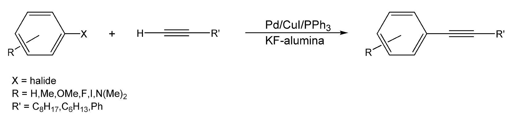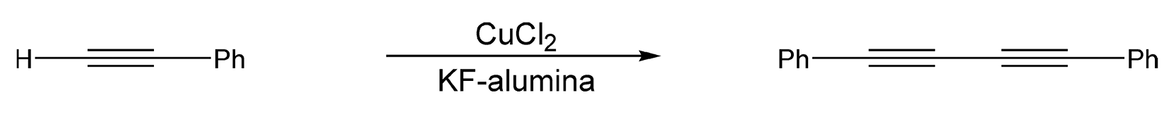 Kabalka and co-workers have also explored solventless, microwave-enhanced reactions on dry media.99-101,628-629 Sonogashira coupling reactions are a palladium-catalyzed reaction between terminal alkynes and an aryl halide. These reactions typically employ a solvent and an amine, which produce environmental burdens. Scheme 14 illustrates a Sonogashira coupling that was performed on potassium fluoride/alumina doped with a palladium/copper iodide/triphenylphosphine mixture. The arylalkynes were synthesized in very high yields (82-97%).99 Another type of coupling reaction that can be performed in a solvent-free environment is Glaser coupling. This copper-catalyzed coupling of two terminal alkynes produces diacetylene derivatives, which are very important in the polymer and material science industries. Phenylacetylene and copper chloride on potassium fluoride/alumina, coupled with microwave irradiation, give diphenylbutadiyne in a 75% product yield (Scheme 15).