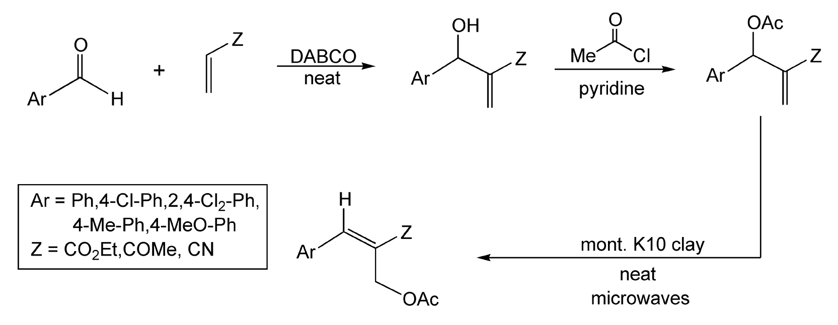 The Baylis-Hillman reaction is an important carbon–carbon bond forming reaction that forms multifunctional molecules. In this reaction, an aldehyde reacts with an electron deficient alkene to yield allylic alcohol derivatives. Isomerization of acetylated Baylis Hillman adducts will yield (E)-trisubstituted alkenes, which are often difficult to synthesize. Microwave irradiation of the functionalized acetates on montmorillonite K10 clay yields trisubstituted alkenes in 13 minutes (Scheme 16).130 The clay acts as a catalyst, since only starting material is recovered in its absence.
