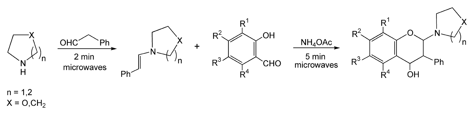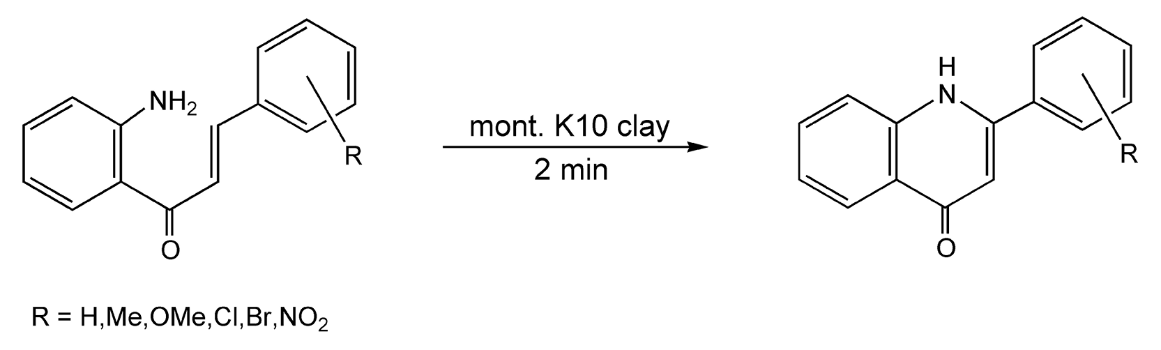 Varma and co-workers have performed extensive research on microwave-assisted, solvent-free reactions in numerous areas including oxidations, reductions, protections, deprotections, and condensations.20,84-98 Many of these are discussed in Chapter 4 and include additional references. Another area of interest is the enamine-mediated approach to isoflav-3-ene synthesis. Enamines are traditionally synthesized via azeotropic removal of water and usually require an initial acid catalyst. Scheme 19 shows a microwave-enhanced, solvent-free, one-pot synthesis to isoflav-3-ene derivatives, which takes place in only seven minutes.98 An efficient microwave-induced tetrahydroquinolone synthesis effected on clay is completed in only two minutes (Scheme 20).96