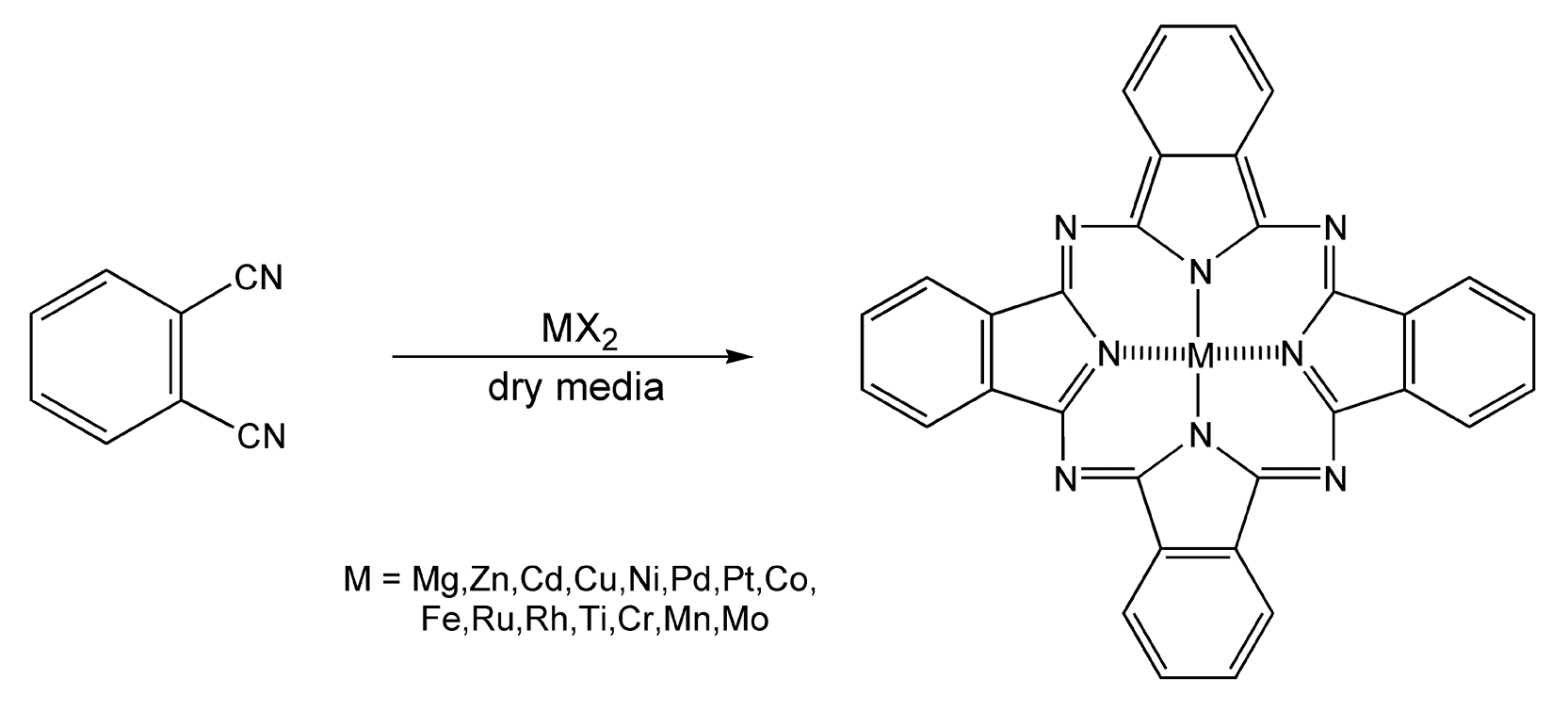 Didier Villemin is yet another researcher who has examined reactions in dry media extensively. Metallophthalocyanines have become important molecules in the material science industries, as they are stable to strong acids and bases, as well as high temperatures. Traditional synthetic routes to phthalocyanines require long reaction times and very high temperatures. Villemin and co-workers have performed one-step metallophthalocyanine syntheses on clay, zirconium phosphate, and encapsulated in zeolite via microwave irradiation (Scheme 21).132 These reactions were completed in only five minutes and in quantitative yields.