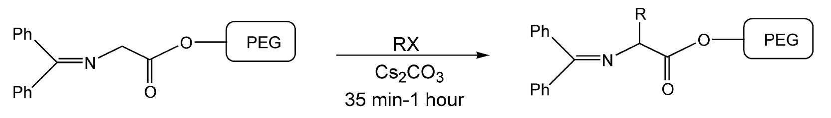 Solid-liquid-phase transfer catalysis is another type of solvent-free reaction. With this method, a reagent acts as both a reactant and an organic phase. Microwave irradiation has been used extensively in these types of reactions.8,50,66,351,472,483,490,491,505,593 An inexpensive and useful phase transfer catalyst (PTC) is polyethylene glycol (PEG). Medium to high molecular weight PEG is a solid at room temperature, but at 50 °C, it melts to become a liquid. At temperatures above 50 °C, derivatized PEG can be used as a soluble polymeric support in the solution phase, but when cooled to room temperature, it becomes solid and provides for simple purification. Scheme 22 exhibits a PEG-supported alkyl-ation of a Schiff base to aminoacid derivatives under microwave irradiation in 75-98% yield.166
