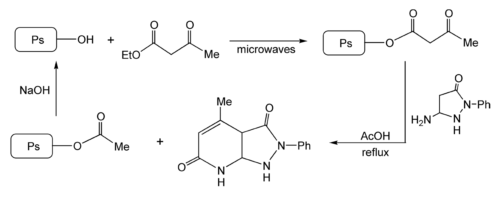 Another useful PTC for microwave-assisted reactions is poly(styrene-co-allyl alcohol) (Ps-OH). This support possesses the properties of both PEG and polystyrene. Vanden Eynde and Rutot rapidly synthesized heterocyclic compounds via supported β-keto esters, with the first step only taking five minutes (Scheme 23).41 The parent polymer can be regenerated from the resulting acylated polymer by saponification.