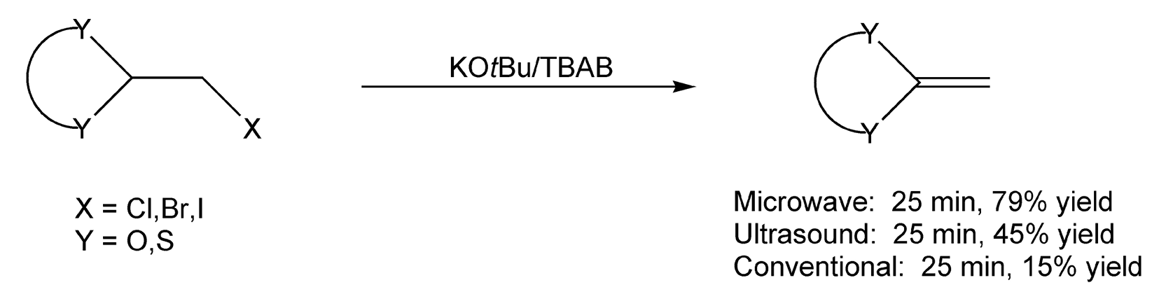 Andre Loupy has also done some interesting research involving phase transfer catalysis coupled with microwave irradiation.8,50,62,351,472,491,505,593 β-Elimination of halogenated precursors, with potassium t-butoxide/tetrabutylammonium bromide (KOtBu/TBAB) as the PTC, provides a new route to ketene O,O- and S,S-acetals (Scheme 24).62 Compared to both conventional and ultrasonic methods, microwave irradiation produced much larger product yields.