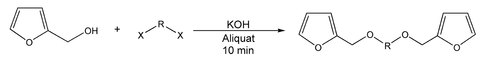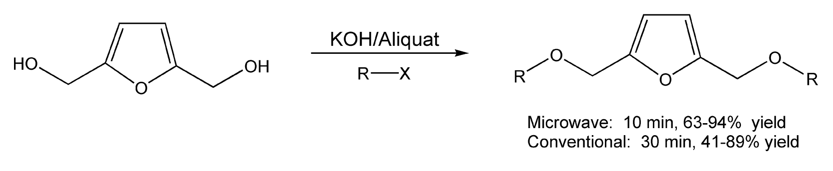 Another area of interest includes the synthesis of furan diethers. These types of compounds constitute a large percentage of the derivatives that make up biomass, a renewable source of natural products. Loupy and co-workers developed two methods of microwave-assisted phase transfer catalysis for furan synthesis, solid-liquid PTC (solid KOH and Aliquat 336) and liquid-liquid PTC (aqueous KOH and Aliquat 336).351 Scheme 25 shows the reaction between 2,5-furandimethanol and an alkyl halide by both PTC methods. Phase transfer catalysis can also benefit the reaction between furfuryl alcohol and a dihalide (Scheme 26).
