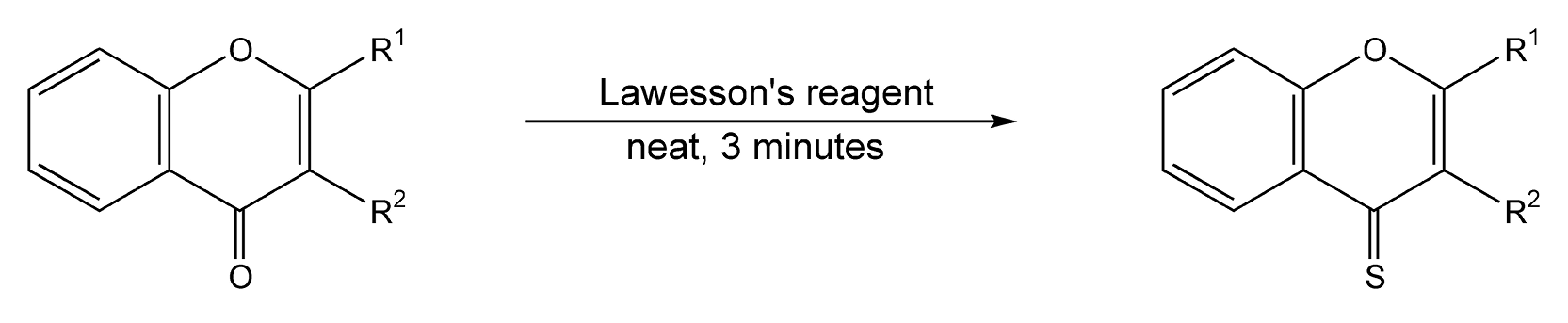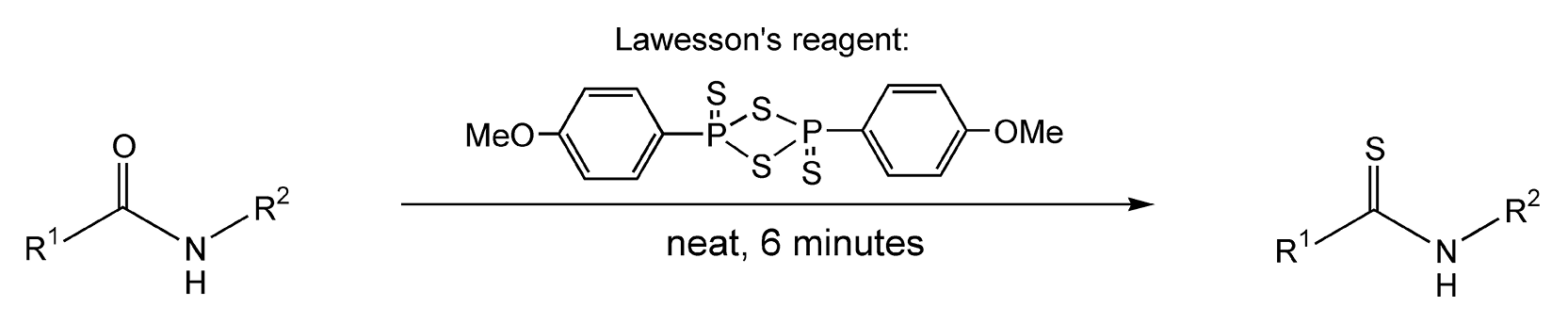 Performing a reaction neat under microwave irradiation is the third type of solvent-free reaction. With this method, neither a mineral oxide nor a PTC is used, and the liquid or solid reagents are used directly from their containers with no dilutions. One interesting neat reaction utilizes Lawesson’s reagent, which transforms a carbonyl moiety into its thio analog. Scheme 27 exhibits the microwave-induced conversion of amides to thioamides in six minutes.88,165 An additional microwave example converts coumarins and other lactones to their thio derivatives in only 3 minutes with quantitative product yields (Scheme 28).88