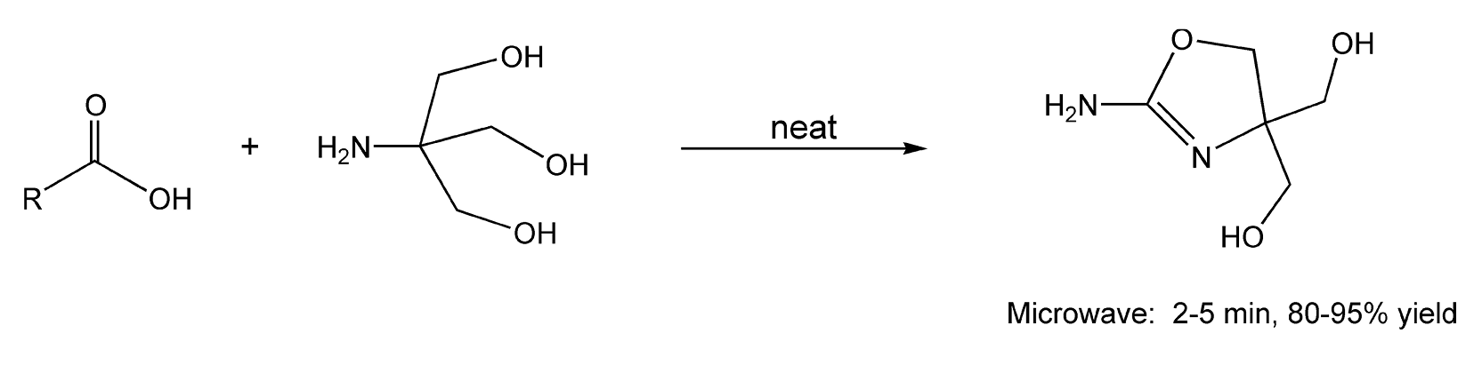 Substituted 2-oxazolines are important heterocyclic intermediates used in drug discovery. Classical syntheses of these compounds require high temperatures, azeotropic water removal, and multi-step procedures. With microwave irradiation, 2-oxazolines are synthesized from the cyclodehydration reaction between a carboxylic acid and α,α,α-tris(hydroxymethyl) methyl amine without any solvent or solid support in 2-5 minutes (Scheme 29).57