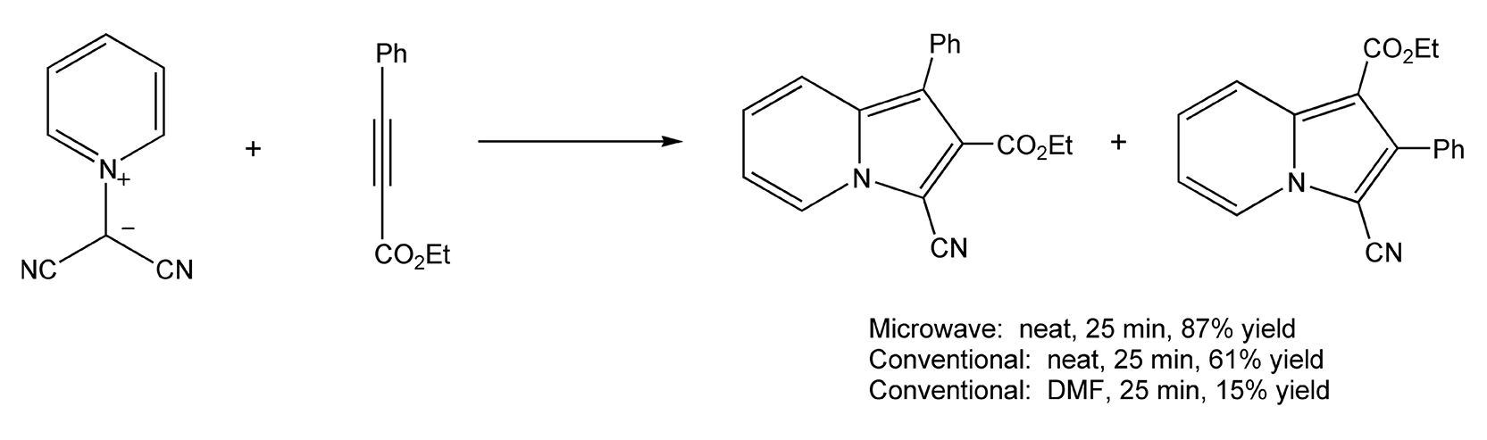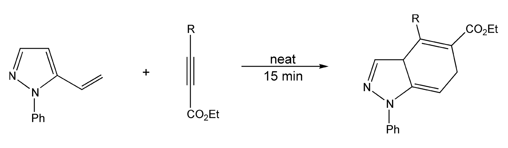 Both Diels-Alder and 1,3-dipolar cycloadditions benefit from microwave-assisted neat conditions, as they require long reaction times and very high thermal temperatures. In a solventless environment, vinylpyrazoles react with substituted alkynes to yield non-aromatic cycloadducts via microwave irradiation in 15 minutes (Scheme 30).214 Schemes 31 and 32 illustrate successful 1,3-dipolar cycloadditions that yielded heterocycles in very high product yields.8,364