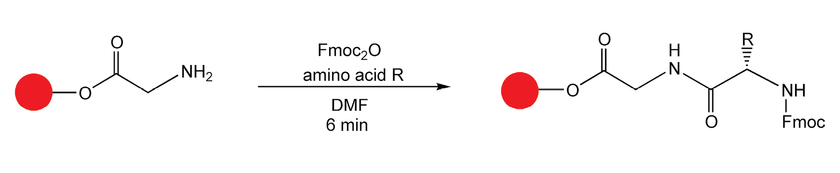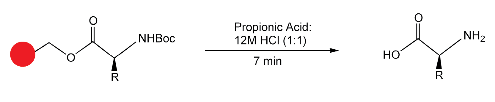 Combinatorial chemistry on solid-phase supports was first applied to peptide synthesis. It made sense to use peptides in the first microwave-assisted, solid-phase reaction. Traditional peptide hydrolysis requires high temperature 6M HCl for at least 24 hours. In 1988, Yu et al. performed a successful hydrolysis in seven minutes in a domestic microwave oven (Scheme 6).27 The same group, four years later, performed peptide coupling reactions in quantitative yields with microwave irradiation (Scheme 7).28