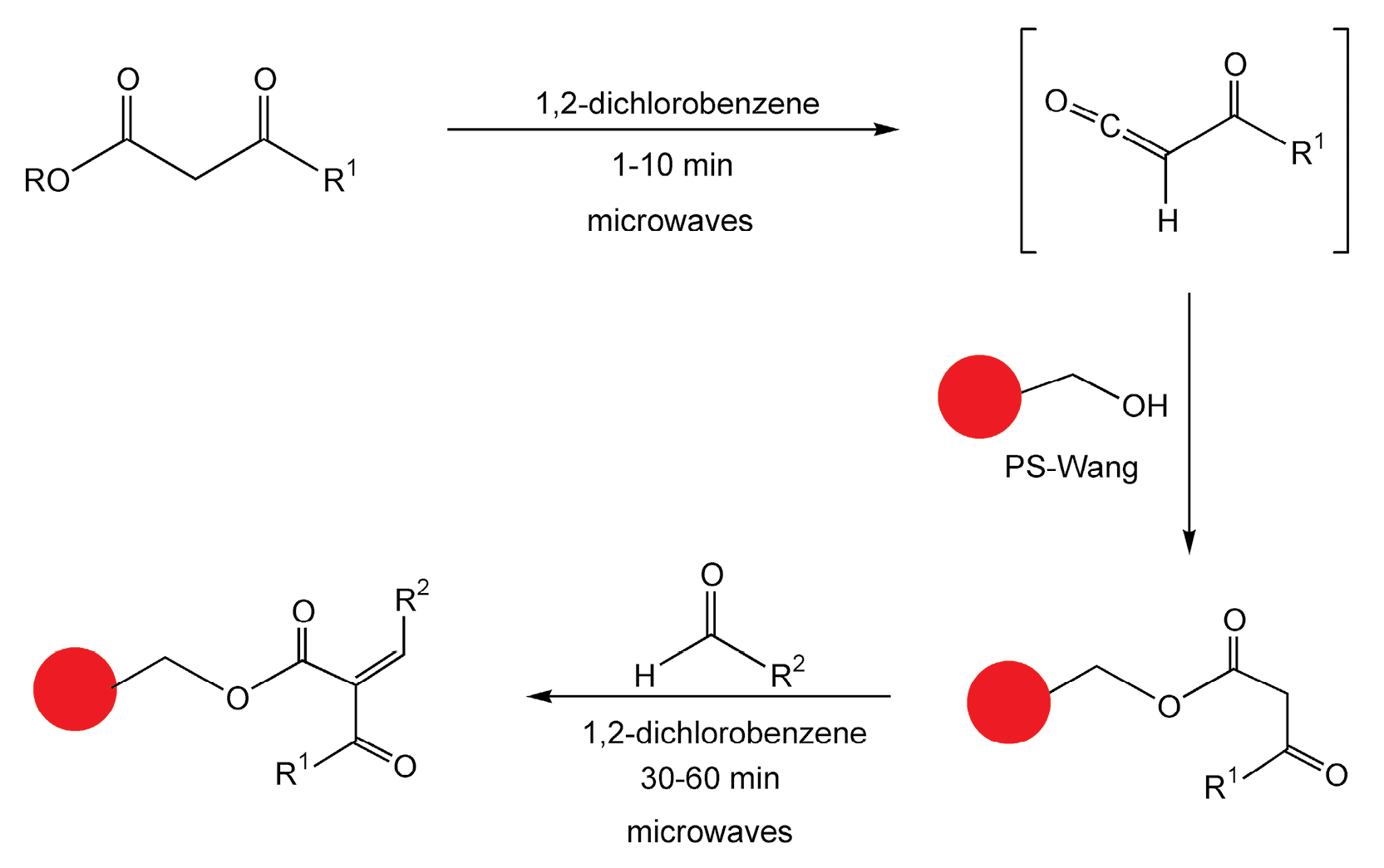 Strohmeier and Kappe have performed an important example of microwave-assisted, solid-phase parallel synthesis.29 Enones, as well as their 1,3-dicarbonyl intermediates, are important building blocks for heterocyclic scaffolds that are used in pharmaceutical drug design. Conventional solid-phase methods require multiple steps and long high-temperature reaction times. In this microwave-enhanced, two-step procedure, acetoacetylation of a polystyrene Wang (PS-Wang) resin to a functionalized β-ketoester, followed by Knoevenagel condensation with an aldehyde, yields enones in less than one hour (Scheme 9).