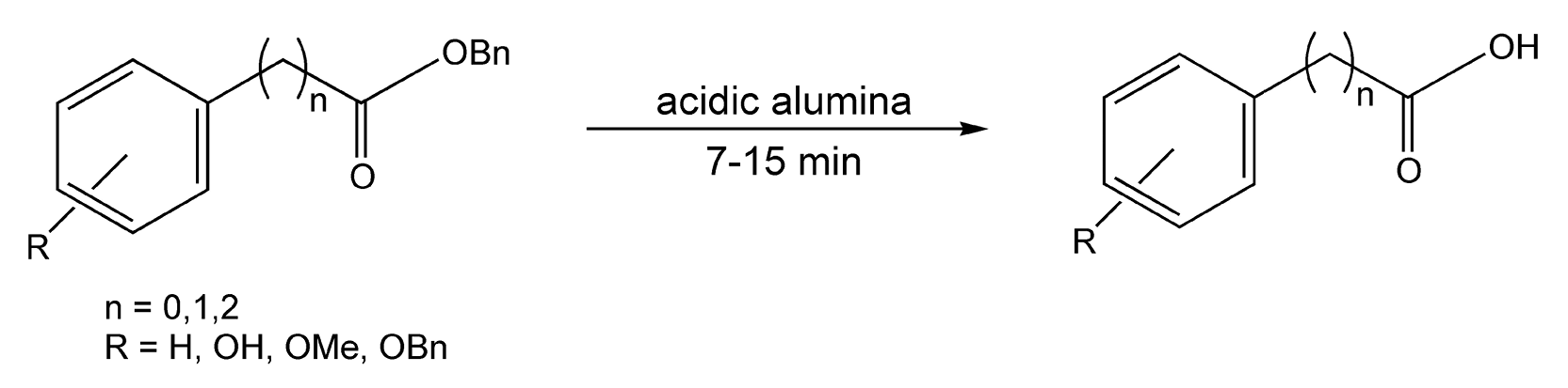 Carboxylic acids mainly need to be protected in order to mask the acidic proton in base-catalyzed reactions. Esters are a useful protecting group for the carboxyl moiety, as they remove the acidic proton and provide for easier handling of the molecule. Deesterification traditionally provides moderate yields and poor chemoselectivity. Varma and co-workers have successfully deprotected benzyl esters in solvent-free conditions on alumina (Schemes 133 and 134).702