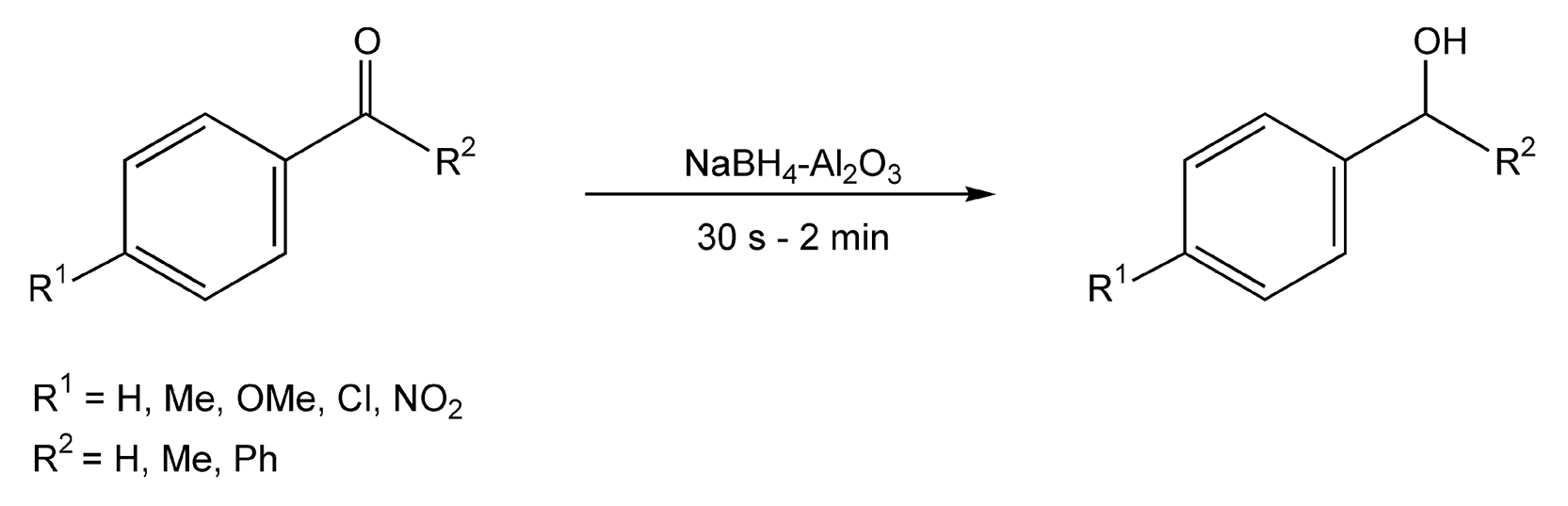 Many versatile reagents can reduce ketones to secondary alcohols and aldehydes to primary alcohols. Sodium borohydride is widely used, as it is inexpensive, compatible with solvents, and safer to use than other reducing agents. Its major drawback is that solvents reduce its reaction rate and a large excess of the reagent is needed to successfully reduce any compound. Varma and co-workers have impregnated alumina with NaBH4 and have reduced ketones and aldehydes with microwaves in a solvent-free environment (Scheme 102).576 These reactions only required 1-5 equivalents of reducing agent and gave 80-93% product yields.