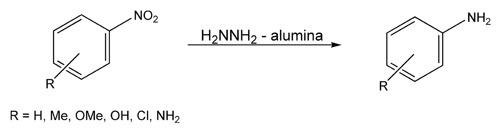 Aromatic nitro groups can be reduced to amines by numerous methods in the solution phase. Conventional reaction conditions usually consist of the nitro compound, hydrazine hydrate, and a metal catalyst in refluxing ethanol or dioxane. Long reflux periods are required for successful reduction. As a solution, microwave-induced reduction with alumina-supported hydrazine and iron(III) chloride provided 100% conversion to aromatic amines (Scheme 105).583