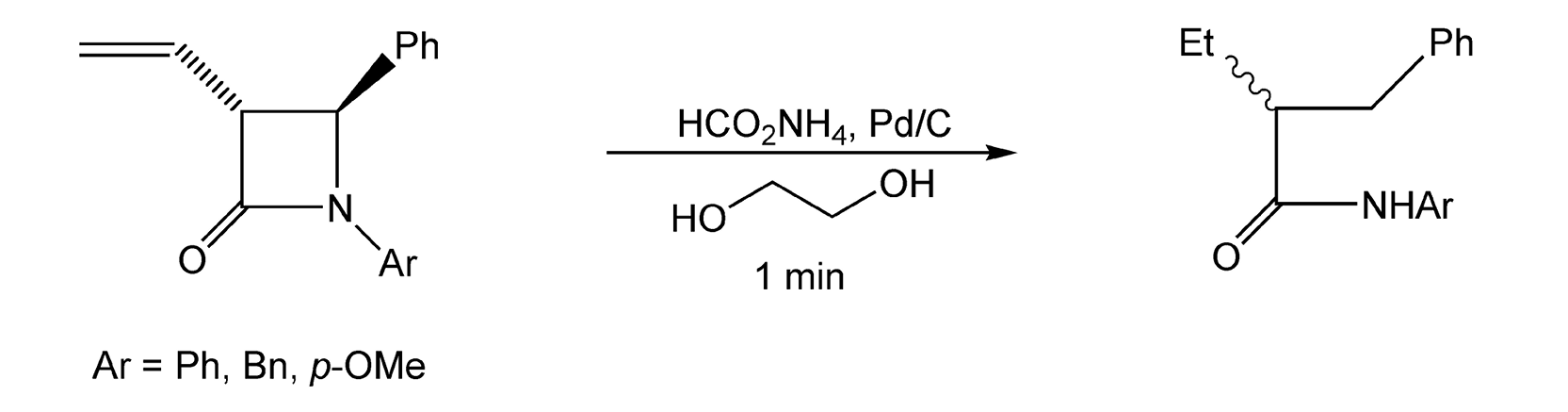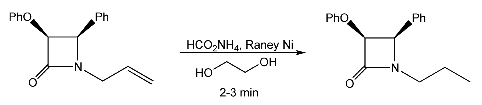 In order to continue their research in microwave enhanced β-lactam synthesis, Bose and co-workers have developed hydrogenation and hydrogenolysis methods that utilize ammonium formate and either a Raney nickel or Pd/C catalyst (catalytic transfer hydrogenation).587 As seen in Scheme 106, Raney nickel will only hydrogenate the carbon–carbon double bond, while use of a Pd/C catalyst will both hydrogenate and cleave the carbon–nitrogen bond (Scheme 107).